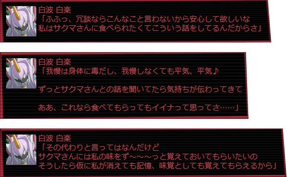 | 「わたしは一方的に喋るけど…… もし返事ができなくなっても、途中で寝ちゃっても大丈夫だからね。 そのまま最後まで残さず食べてあげるから。」 |