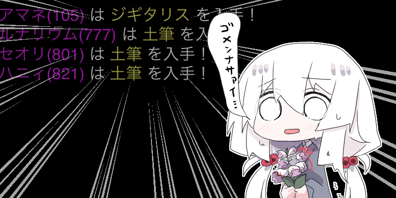 | 16 | ぬめぬめ | 素材 | 10 | [武器]列撃10(LV25)[防具]舞反10(LV25)[装飾]幸運10(LV10) | |||