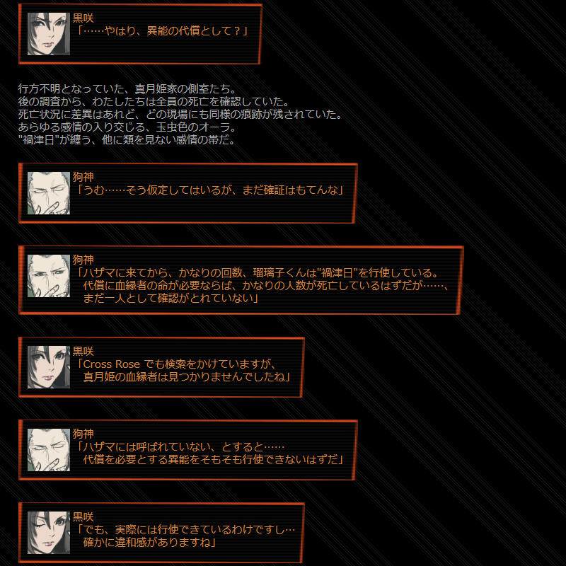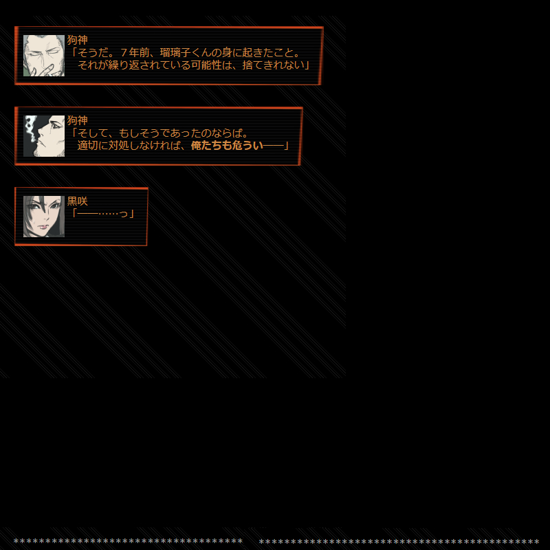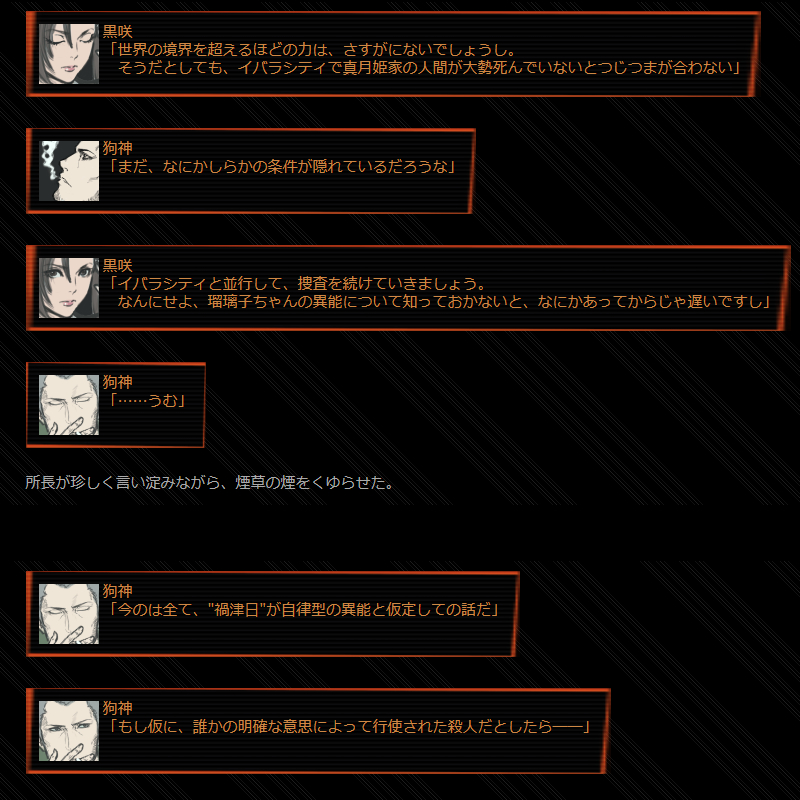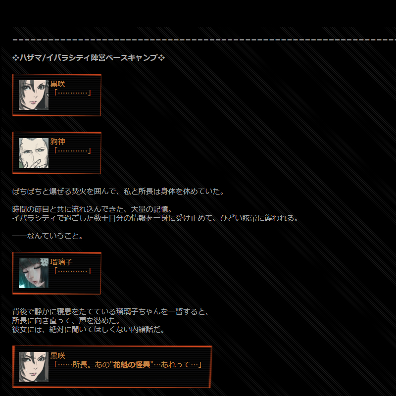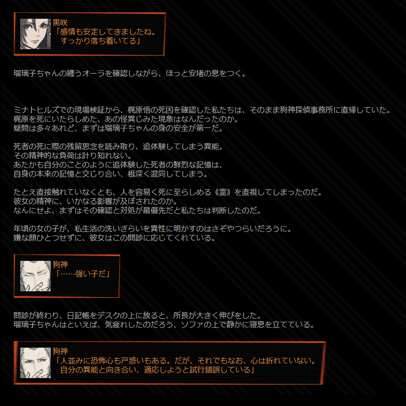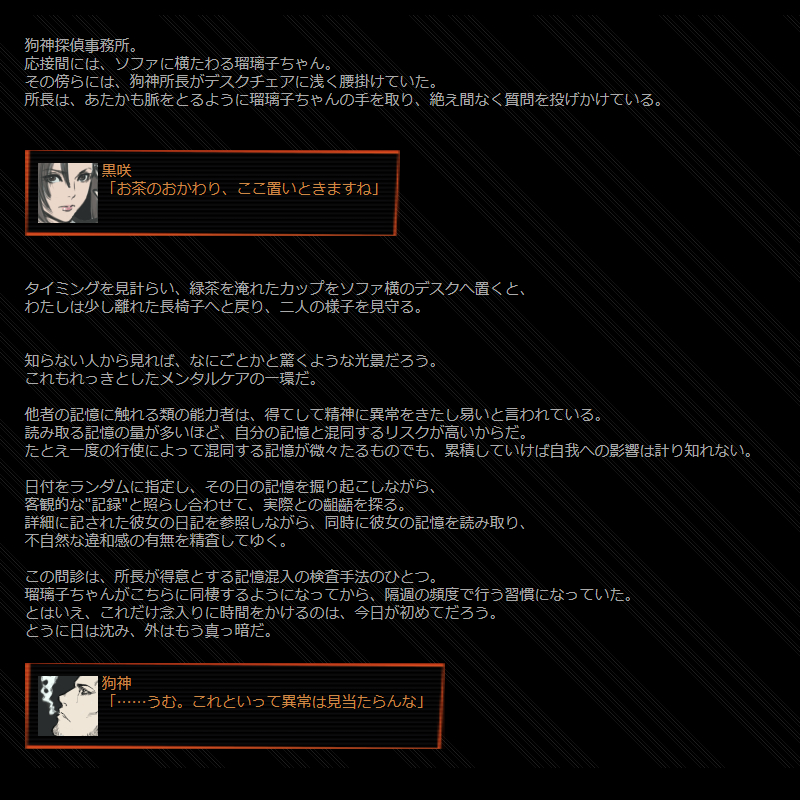 | 黒咲 「所長、くれぐれも食べ過ぎないように」 |
