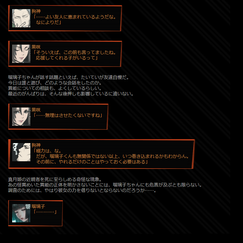 | 瑠璃子 「……いえ、わたくし独りでは食べきれませんので どうぞ、お好きなだけ……よろしければ黒咲様も……」 |