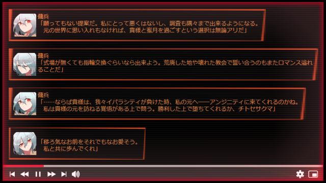 少女 「ありがとう。でも今回はもう無理、次のワールドスワップで会えたら嬉しい。 そのときこそ、私を壊してほしい。無くしてほしい。」 |