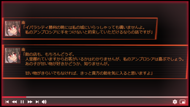 雫玖 「アダムスからのメッセージ、色々と気になる点も多いんだけど……。 とにかく最終盤、頑張ろう」 |