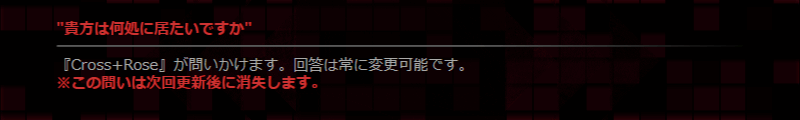 | サクマ 「Cross+Roseからの『問いかけ』は、 アダムスからのものだったのね。ノウレットじゃなかったわ。 ……じゃあ、今回のお題はそれにしましょうか。 『Cross+Roseからの問いかけにどう答えるか』 聞いていいかしら? 別に、どう答えたって怒らないし、 秘密にしておきたいならそれでもいいからね。」 |
