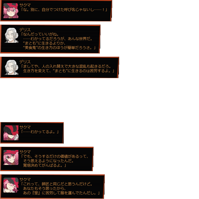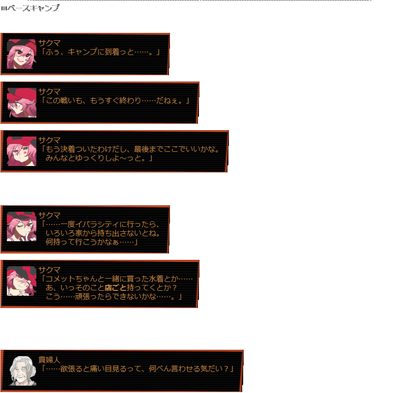 | サクマ 「次は『さよなら』『またね』になるだろうし。 『言いたいことは今のうちに言おう』 これが最後のお題になるかな。」 |