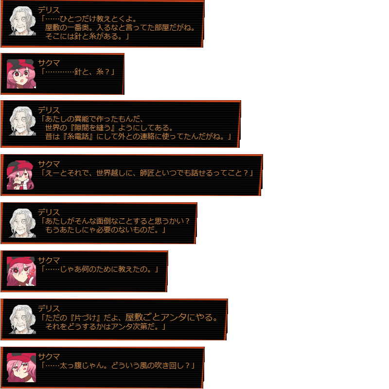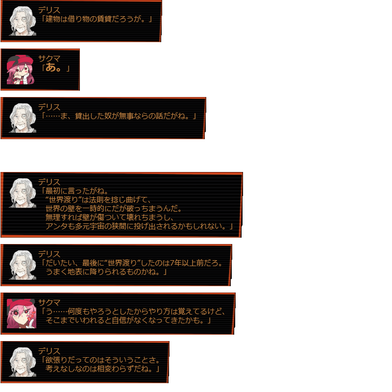 声 「否定の住人が外に出ることで混乱もあるでしょう。 響奏の住人が否定の世界に閉じ込められれば、他の世界も動くことでしょう。」 |