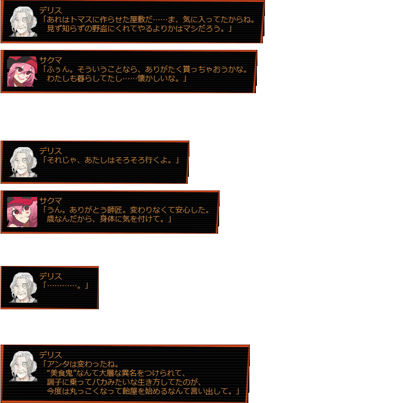 | サクマ 「エリカは次のステージへ、って感じかな! アンジニティで、スリルと冒険を楽しんでね。 あっちで会えたら、ごちそうするわ。」 |