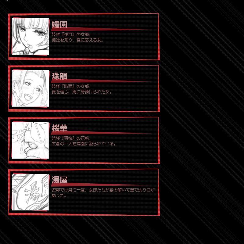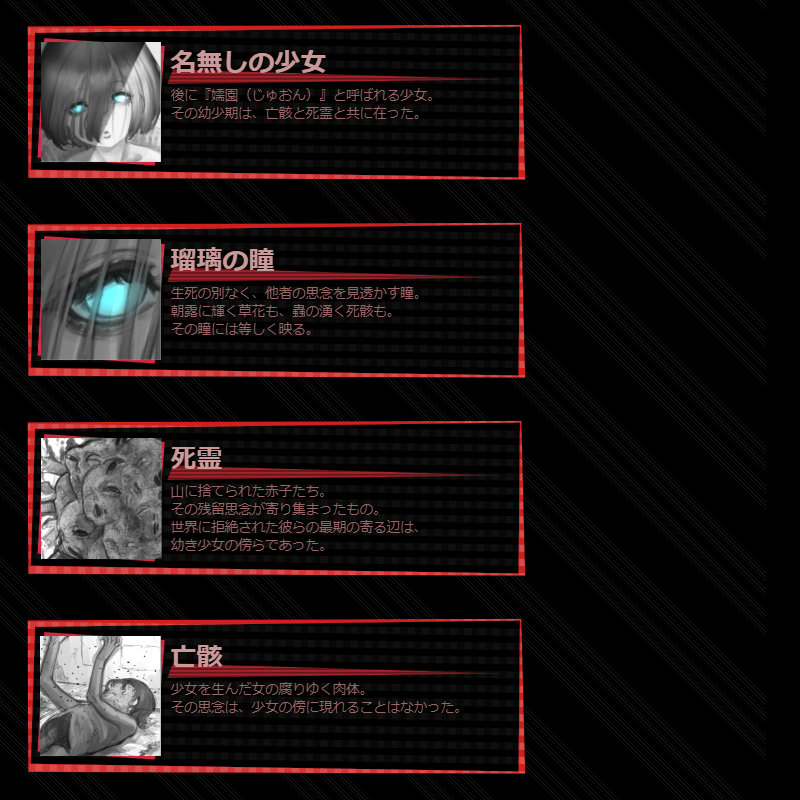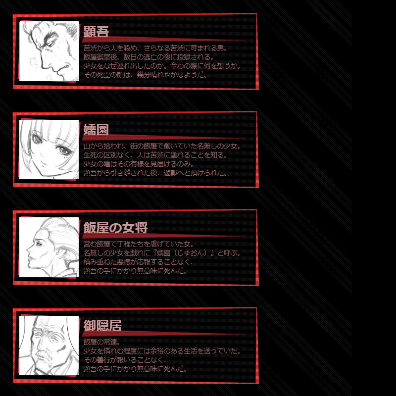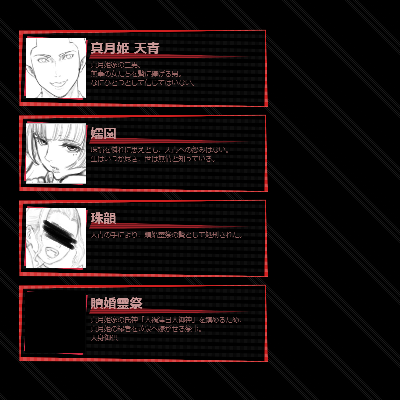 | 呪器作製 | 5 | 0 | 0 | 【常時】生産行動『装備作製』で武器「呪器」を選択できる。呪器は強さが高いが効果3に自滅LVが付加される。