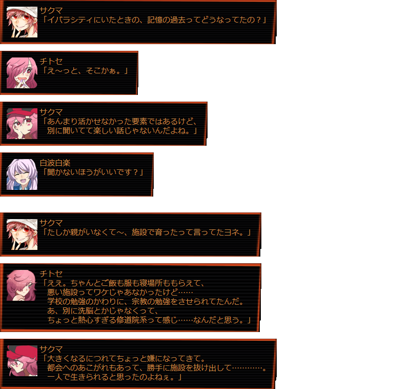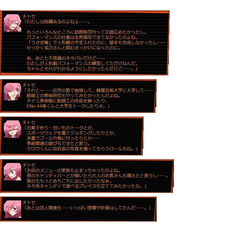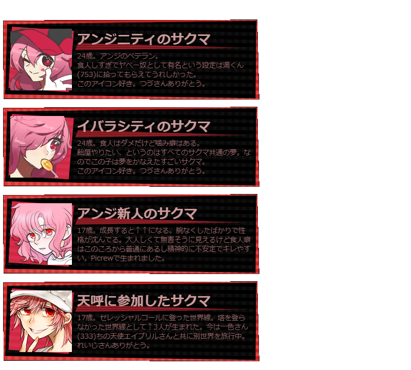 | サクマ 「ん~と、そうだな…… もーちょっと悪役モードしたかったかな~。 結構早めにイイヒトモードなってっちゃったよね。 アンジニティ同士でインネンつけたりとか。 ラプリナさんとか、悪人同士でもっと絡みたかったひとも結構いたしね。 せっかくこういうアイコン用意してたしさ。 あとは片道切符チャットをもう少し飛ばしてもよかったかもねぇ。 それと、花壇はもっと賑やかにしてみたかったな。」 |