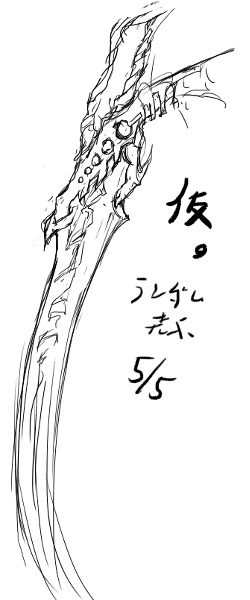 平時は周囲の環境に合わせ人型で過ごしている。 本体は刃渡り凡そ六尺五寸、漆黒両刃の大型曲剣。 区分的には、インテリジェンス・ウェポン(意思を持った武器)の系譜。 仔細不明ながら、当事者が『人化の法』と呼んでいる何らかの術で、姿を変えている。人型以外も『外観だけ』ならば真似られるらしい。人化だけは中身も相応なので、飲食睡眠その他、基本的な生体活動が可能。活動しないことも可能。便利。