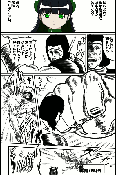 第5話『兵士道はシグルイなり』 絶対なる王。 その王を頂点に頂き、それを支えることで国は安定する。 ネクターの独占について殊更に取り沙汰されるが、 それが何だというのだ。 きっと王なりの深慮遠謀があってのことなのだ。 国民は神を敬うように、 神より民を支配する権利を与えられた王を崇めねばならない。 国民は王を疑ってはならない。 国民は王に従わねばならない。 一揆などは以ての外である。 一揆に加担した者は非国民と見なし殲滅する。 + + + 「・・・ですって。」 「ああ、言いそうだな。班長なら。」 「ガチガチの信者っスからねー。」 俺が兵士になったのは、とりあえずは食いっぱぐれが無いからだ。 できることなら当然中央で憲兵にでもなってのほほんと暮らしたかったが、 それこそ倍率が高くて俺なんかじゃとてもとてもって有様だ。 おかげで今はこんな辺境にいる。 まあ、主な任務は見張りだし、それで三食きっちり食べられるんだから御の字だ。 故郷じゃネクターが独占されようがされまいが不作だ凶作だとなると まともな飯が食えないなんてのはしょっちゅうだった。 王様様ってもんだ。 「早く終わって欲しいもんだな。」 「ですよねー。娘さんに早く会いたいですもんね。」 「いやー、そうなんだよ。もうそれが楽しみで・・・」 先輩は奥さんの出産に立ち会えなかった。 娘さんの顔もまだ見ていない。 俺は奥さんにも娘さんにもあったことがないが、 気立てのいい奥さんだと言う。 先輩も何だかんだで面倒見のいい人だから、奥さんもいい人なんだろうな。 根拠はないが何となくそう思う。 「交代の時間であります!」 「ん?ああ、そんな時間か。じゃあ、頼むぞ。」 「ハッ!」 先輩と入れ替わりに後輩がやって来た。 「・・・早く敵が来ないですかね。」 「え?何?敵に来て欲しいの?」 「僕は一刻も早く反逆者どもを殲滅したいんです。」 こいつはいつもこうだ。正直しんどい。 でも、責めるに責められない。 この後輩は一揆で母親を亡くした。 王の方針に村ぐるみで賛成ってんで 一揆をやろうって連中に目を付けられて襲われて その時に母親は亡くなったそうだ。 「中には他の世界から観光がてら一揆に加担してる奴もいるそうです。 舐めやがってクソが・・・」 根はいい奴なのだが、正直めんどくさい。 あと理由が理由だけに絡みづらい。 母親が死んだことをネタにしたりは流石に気が引ける。 ただ、班長とは相性が良いみたいだ。 「非道な非国民どもを血祭りに上げ、母の墓前に捧ぐのだ!」 「ハッ!」 なんて会話は流石に俺には無理。 因みに班長は班長でめんどくさい。 真面目一徹というか、融通が利かないというか、とりあえず俺は苦手だ。 あんまりプライベートについてはよく知らないが、 一家全員軍人の家系らしい。 ただ、言っちゃ何だがあんまり出来は良くないみたいだ。 基本マニュアル通りにしか行動しない。 とはいえ、自分の考えを捨ててマニュアル通りに行動できるってのは ある意味社会人としては正しいのかもしれないが。 いや、そもそも自分の考えってもんが無いのかもしれない。 それはそれでまあ、考えようによったら強みだよな。 「先輩!向こうから何者かが・・・」 「ん?本当だな。」 さて、とうとう敵のお出ましか? 人影?いや、この距離で人があんなに・・・ 人だとしたらデカすぎる。 人間じゃない。人型の何かだ。 近づくにつれ、姿がハッキリわかる。 デカい。全身緑色。手に何か持っているのか?掌がこちらを向いてるからよくわからない・・・ デカいぞ。6メートルはあるか?しかも、何て筋肉だ・・・ こいつも、一揆に?何なんだ?敵の新兵器か? まるっきり怪物だ。無理だ。こんなものと戦えるはず・・・